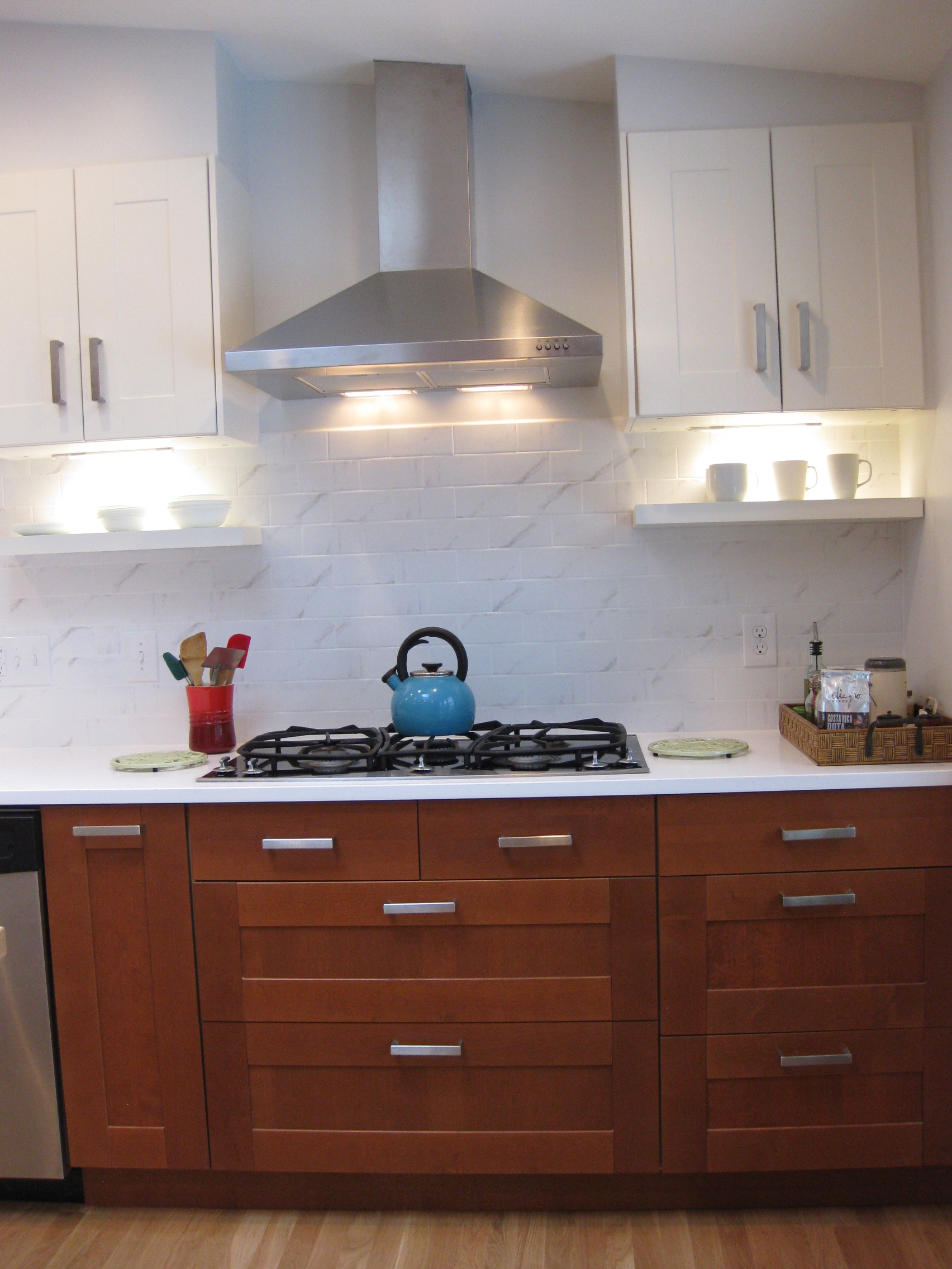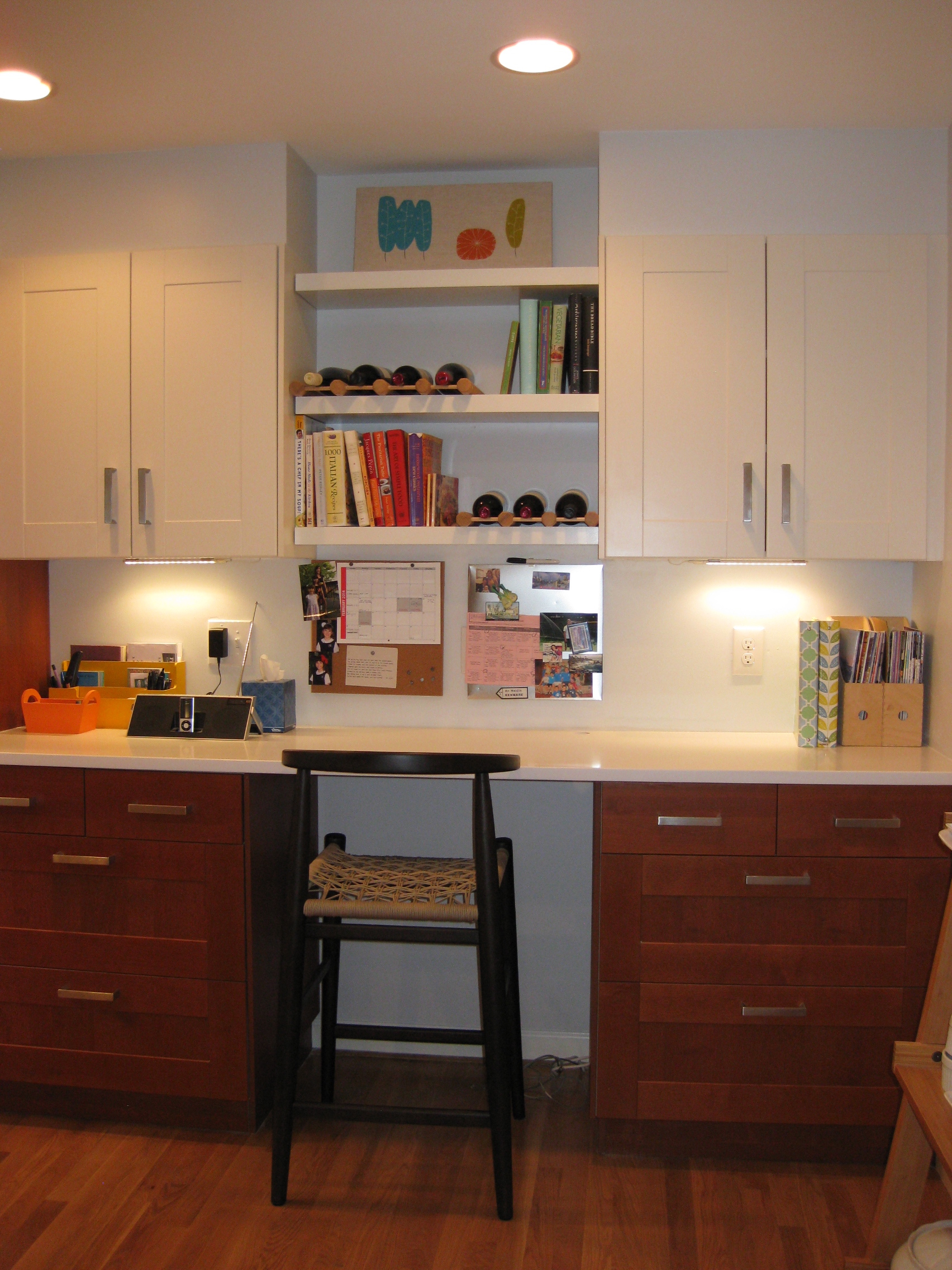 Most of the items pictured are from IKEA: cabinets (Akurum cabinets, Adel doors), countertops (Numerar wood counter on island, pure white quartz stone everywhere else), exhaust hood (Luftig) and double oven (Framtid). We kept our existing fridge, microwave, dishwasher, range, barstools and leaning shelves. We purchased some excellent floating shelves made of MDF that we painted to match the cabinets and a neat chair from West Elm that fits the desk space well.