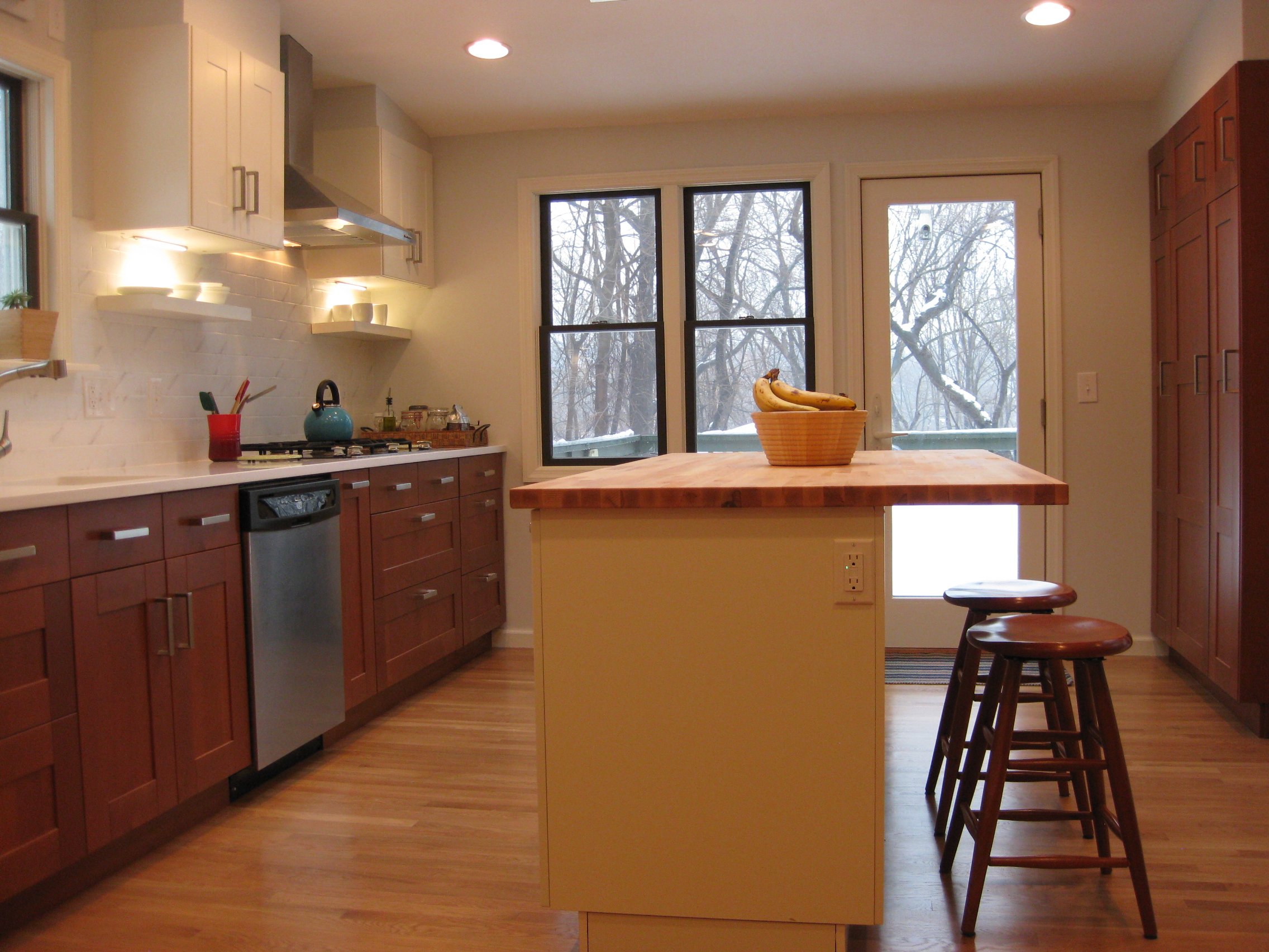 We’re now about 3/4 of the way through. 1st pic is from the second or third day of demo (10th or 11th), 2nd pic is after they put in the floor and cabinets with a temporary sink (13th). 3rd pic is from yesterday – island is in and we did some painting to the trim and windows. Countertop should be in at the end of the week. After they install, the gas range will be connected and they’ll do the backsplash tile.