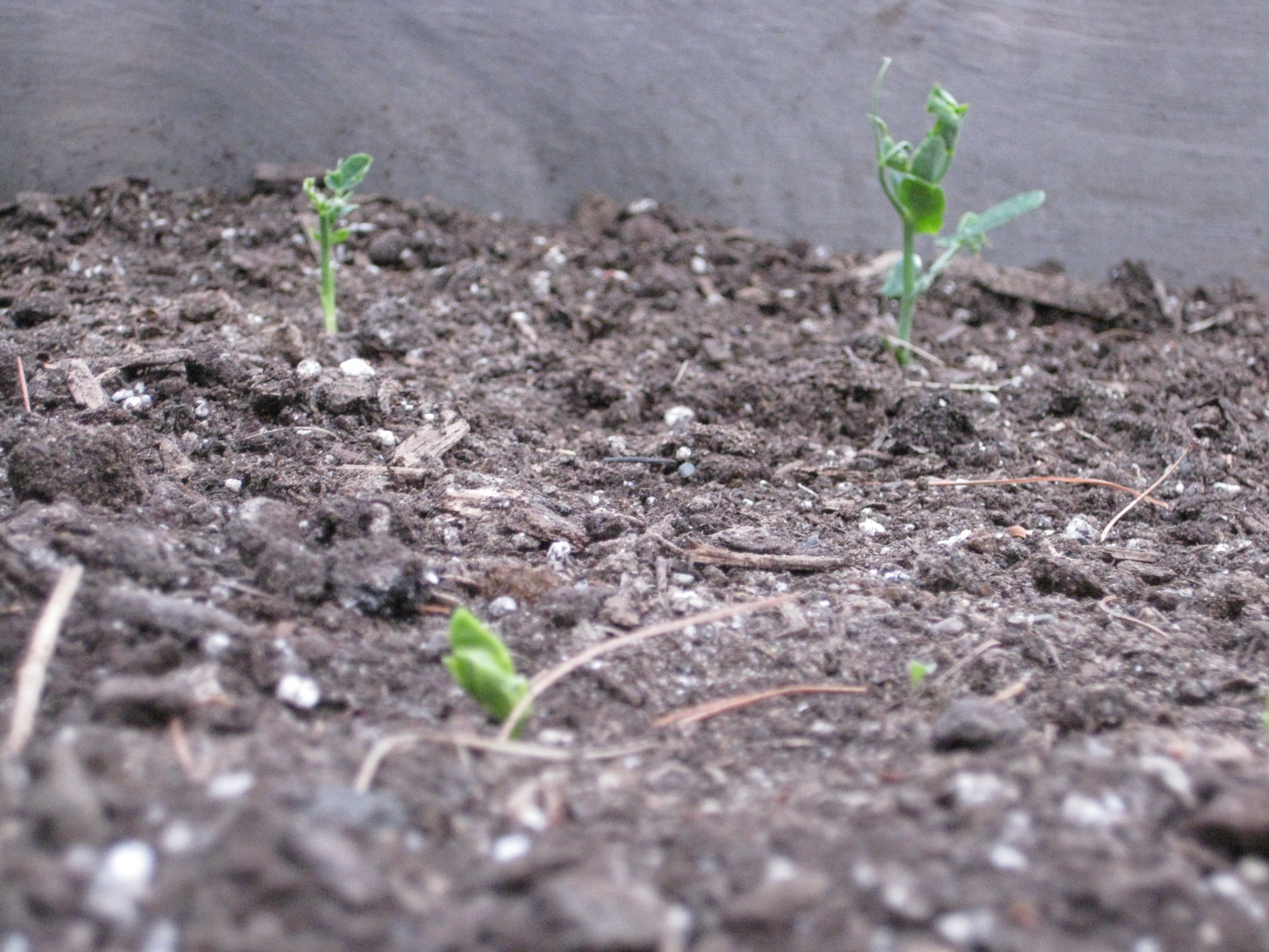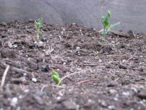 Peas are coming up nicely, about 35 plants so far. I need to get something in the bed for those guys to start climbing on.