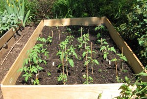 With the lettuce gone, I put in my pepper seedlings (bell, jalapeno) and pole beans (Fortex). The new raised bed has the majority of my tomato seedlings, along with three bush bean (Provider) seedlings and some corn (Dorinny).
